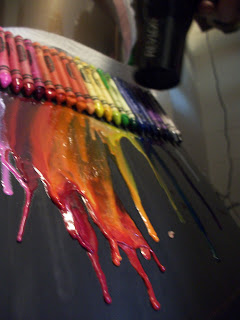 I began with some crayons organized in rainbow order, a hot glue gun, and canvas painted black (any color works), and a hair dryer.